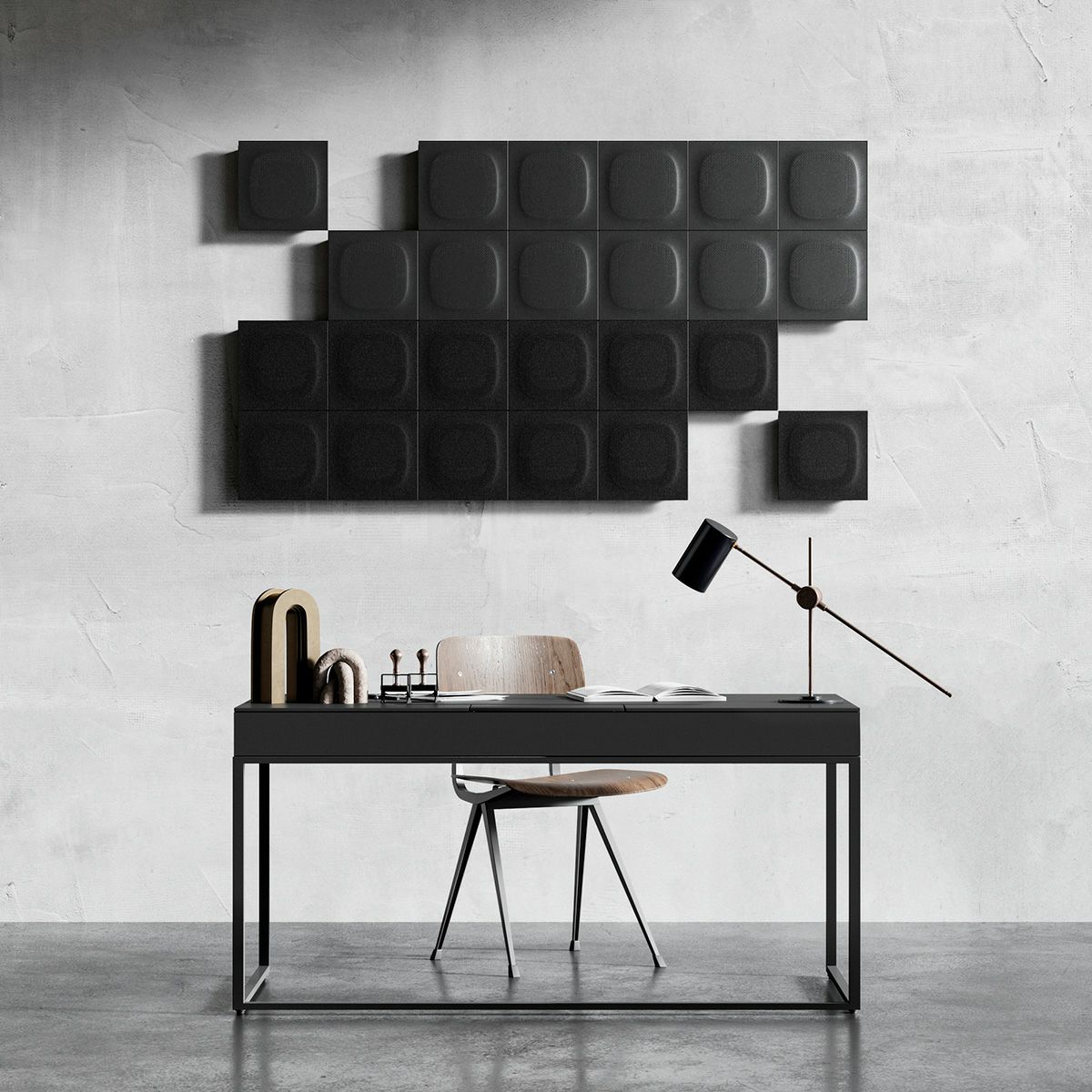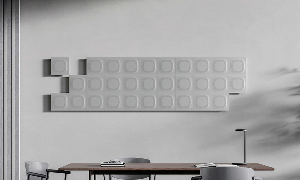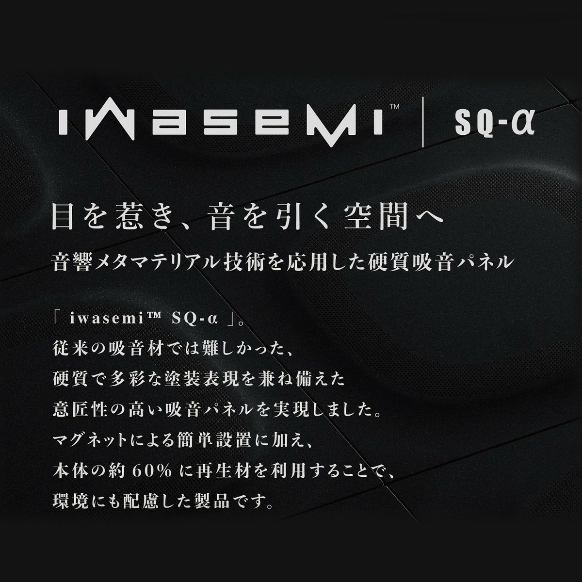CONCEPT 目を惹き、音を引く空間へ 音響メタマテリアル技術を応用した硬質吸音パネル「iwasemi™ SQ-α」は、 細部まで佇まいにこだわった吸音材です。 iwasemi™ だからできた、空間になじむ硬質な素材・多彩な塗装表現。 目を惹き、音を引く空間を実現します。